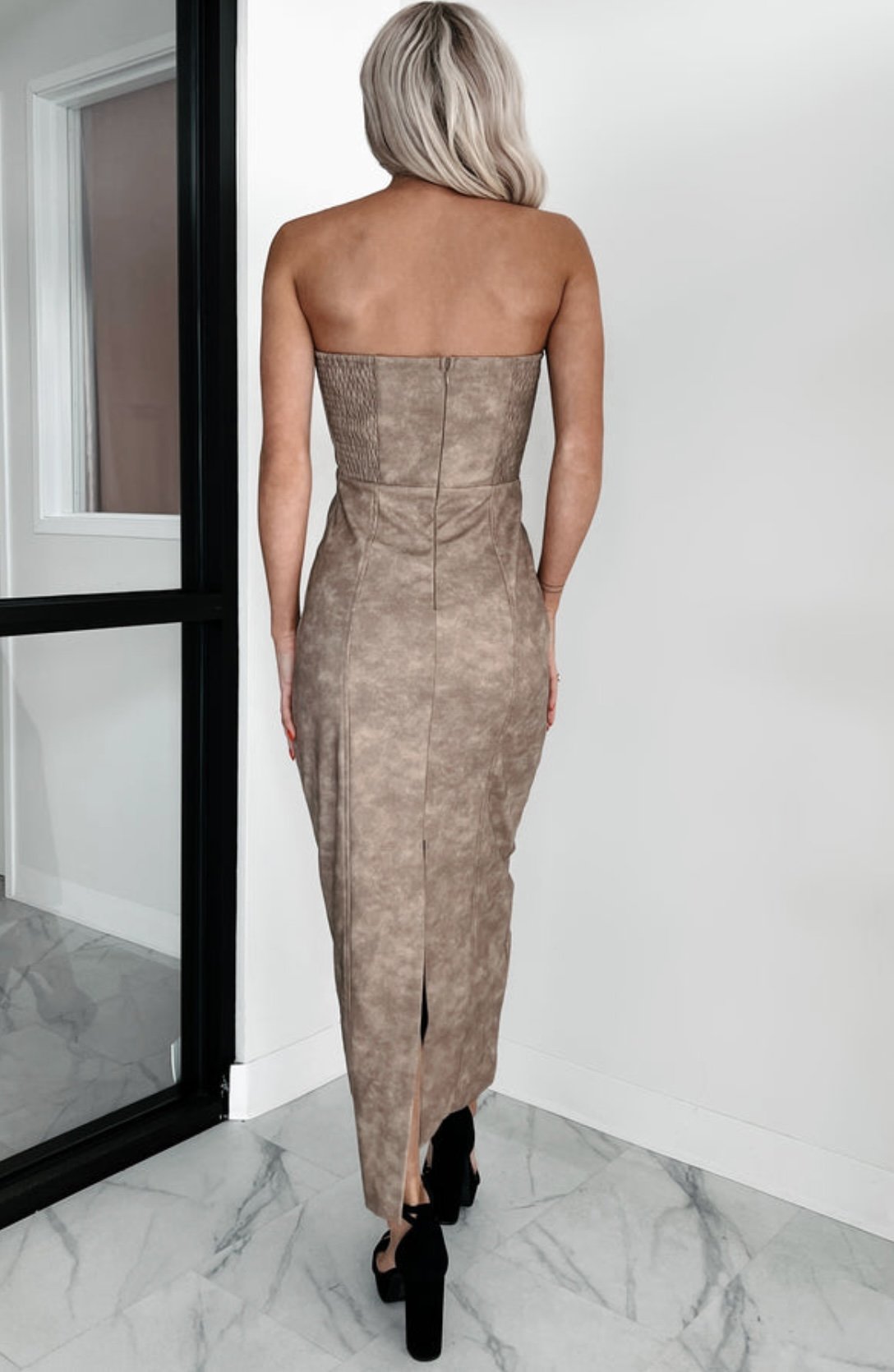Vegan leather strapless maxi/midi dress with back slit. Model is 5’6 and in a size Small. Measurements, 45” from armpit to hemline. SELF: 60% PU, 40% POLYESTER. LINING: 95% POLYESTER, 5% SPANDEX.